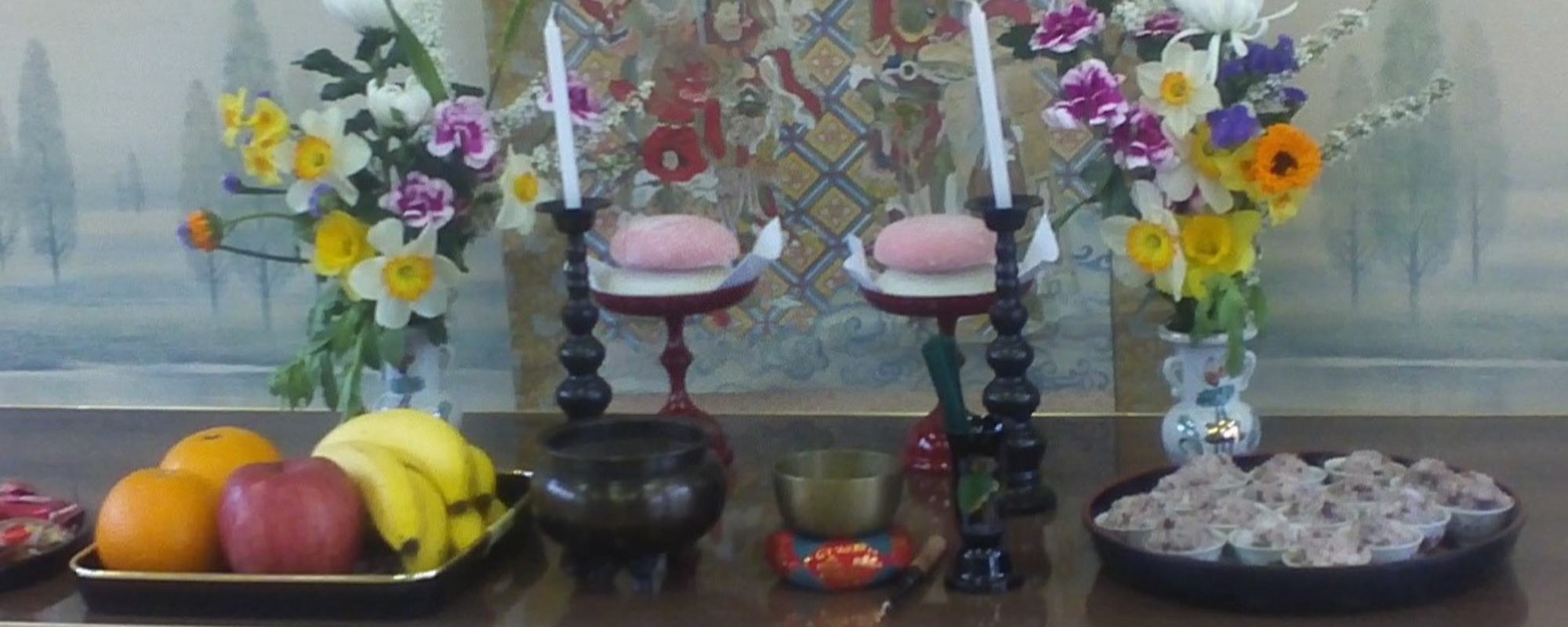 薬師様お供え=甘茶・紅白餅・接待用小餅