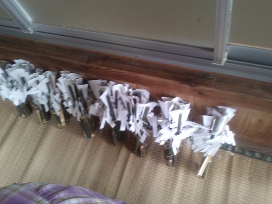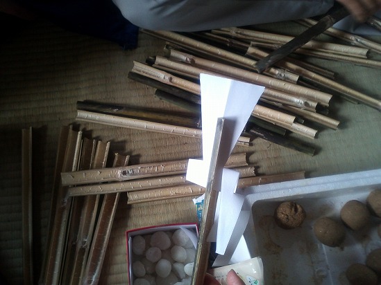 渡し品 ・提灯、ろうそく(大2個、各家分)――11月2日夕方持参 11月1日 ・13時集合――男性のみ ・篠竹準備――すべて姫竹。(早く準備すると竹が固くなるとのことで前日にした) ・篠竹加工(竹に切れ目を入れる) 231cm 2本 75cm 4本 60cm 17本 ・割竹(幣串) 77本(宮司様より正月祭の時の細い幣串タイプでOKとのこと) ・その他、神木を囲む細竹4本